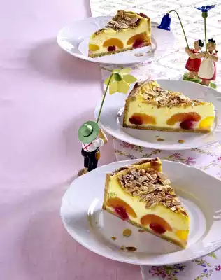 Place a raspberry in each apricot bowl. Place the apricots on the ground with the convexity upwards. Pour the cheese mixture into the mould. Bake in the preheated oven (electric cooker: 175 °C/ convection oven: 150 °C/ gas: see manufacturer) on the 2nd rack from below for 60-70 minutes. Cover with foil after approx. 50 minutes