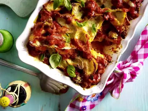 Pour about half of the pasta sauce over it. Place the rest of the pasta on top and spread the rest of the sauce on top. Sprinkle with parmesan. Bake in the preheated oven (electric cooker: 200 °C/ convection oven: 175 °C/ gas: see manufacturer) for about 30 minutes. Garnish with basil and oregano