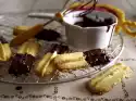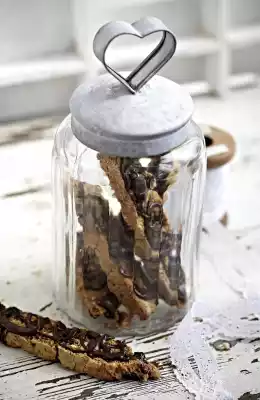 Now melt 100 g chocolate in a hot water bath. With the help of a spoon, squirt in strips onto the cooled biscotti. Allow to dry