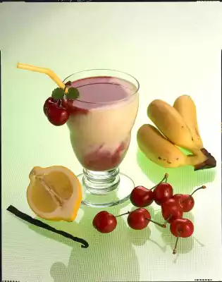 Peel and chop the banana. Finely mash the banana, lemon juice and peel and vanilla sugar. Stir in yoghurt drink with a whisk. Fill banana mixture into glasses. Pour cherry nectar on top.
