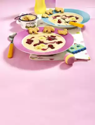 Add milk and mix in with the blender. Add sauce powder and puree everything again. Peel 1 banana and cut into slices. Serve the soup with banana slices and compote. Serve with biscuits