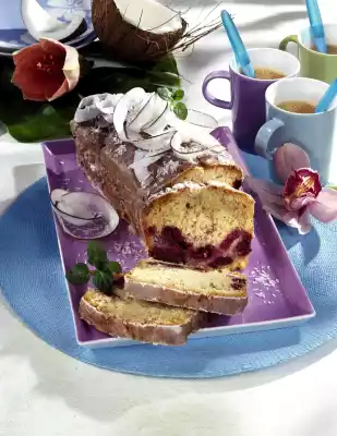 Drain cherries well on a sieve and mix with 1-2 tablespoons of flour. Cream soft fat, sugar, vanillin sugar, lemon peel and salt. Add eggs alternating with 3-4 tablespoons of cornflour and stir well. Mix the remaining flour, cornstarch, grated coconut and baking powder and add it together with 75 ml coconut milk to the fat egg mixture and stir in briefly. Finally fold in the cherries.
