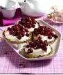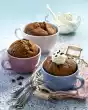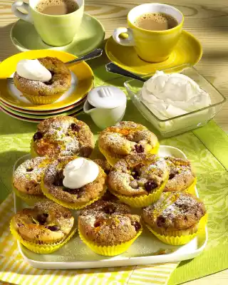 Line a muffin tin (12 troughs) with paper cups and spread the dough in them. Bake in the preheated oven (electric cooker: 200 °C/ convection oven: 175 °C/ gas: level 3) for about 25 minutes. Let cool on a cake rack. Melt 50 g sugar in a pan until golden brown. Draw strips on a lightly oiled piece of aluminium foil and let them dry. Dust the muffins with icing sugar and decorate with caramel
