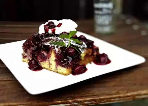 Leave the cake to cool in the mould for about 10 minutes, remove from the edge and allow to cool completely. Whip cream with 2 tbsp. sugar, vanilla sugar and cinnamon until stiff. Dust the cake with icing sugar. Serve with the rest of stewed cherries and whipped cream.