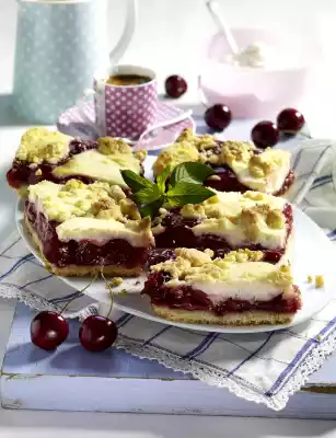 Put about 3/4 of the crumbles on top and press to a flat bottom. For the cheese mixture, mix curd, 1 packet of vanillin sugar, 40 g sugar, 1 egg and 15 g starch until smooth. Stir the cherries until smooth and spread on the base, smooth it down. Spread the cheese mixture in patches on top. Sprinkle with the remaining crumbles. Bake in the preheated oven (electric cooker: 200 °C/ convection oven: 175 °C/ gas: level 3) on the lower rack for 35-40 minutes. Let cool on a cake rack. Cut into pieces and decorate with mint