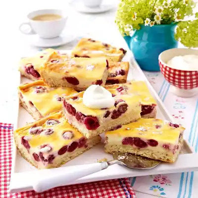 Stir the pudding briefly. Spread on the dough. Spread the cherries on top.
