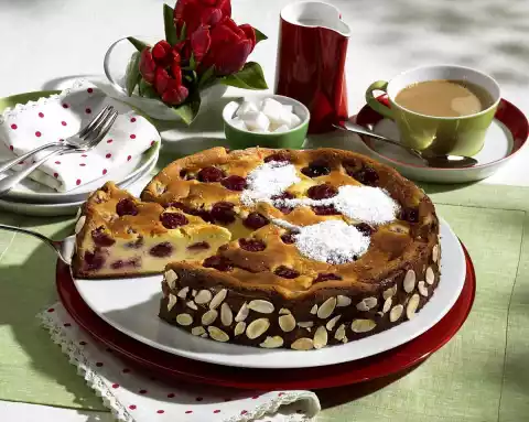 Bake in the preheated oven (electric cooker: 175 °C/ convection oven: not suitable/ gas: level 2) for 60-70 minutes. Take out the cheesecake, remove the cake edge from the edge of the tin with a knife, let it cool down a little. Remove the edge of the springform pan and let the cake cool down. Cut out a stencil as a cherry with a stalk. Put it on the cake and dust it with icing sugar. Whipped cream tastes good with it