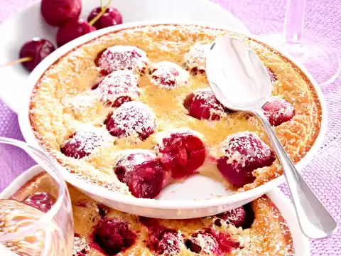 In a bowl, beat the eggs and 60 g sugar until creamy. Add flour first, then milk while stirring. Spread the mixture over the cherries and bake in a preheated oven (electric cooker: 200 °C/ convection oven: 175 °C/ gas: see