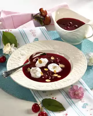 Wash and stone the cherries. Bring 1 litre of water, cinnamon, lemon peel, 3 tablespoons of sugar, salt and cherries to the boil and cook for about 10 minutes. Mix pudding powder with 1 tablespoon of sugar. Gradually stir with 3 tablespoons of cold water until smooth. Stir the mixed powder into the cherry soup and cook for about 1 minute while stirring. Let the cherry soup cool down, stirring from time to time. Roast almond flakes in a pan without fat until golden brown.