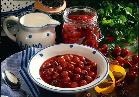 Wash the cherries, remove the stalks and allow to drain. Wash the orange, peel the skin thinly and cut into strips. Squeeze the orange. Bring juice, 3/4 litre water, sugar and star anise to the boil while stirring. Fill cherries into glasses and pour the sugar solution over them.