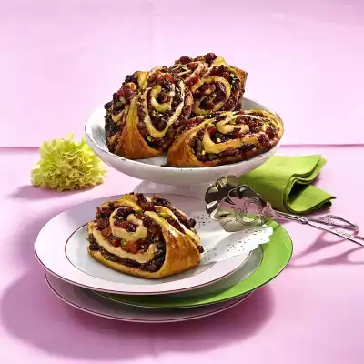 Brush the dough plate with lukewarm, liquid fat and spread the jam evenly, leaving approx. 1 cm free on the longer sides. Spread apricots, pistachios and cranberries on top. Roll up the yeast dough firmly from the long side and press the end firmly. Cut the roll diagonally into approx. 10 trapezoidal pieces (8 x 2 cm) and press them firmly into place on the narrow side using a wooden spoon handle. Put snails on 2 baking trays lined with baking paper and let them rise covered for another 15 minutes. Mix egg yolk and cream and brush the snails with it. Bake in the preheated oven (electric cooker: 200 °C/ convection oven: 175 °C/ gas: level 3) for 10-15 minutes. Take the tray out of the oven and let the snails cool down lukewarm on a cake rack
