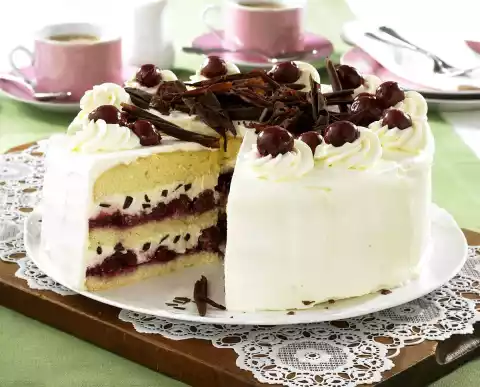Spread the rest of the cream all around the cake. Spray 12 cream tuffs onto the cake. Place 1-2 cherries on each tuff and chill the cake for about 1 hour. Melt the chocolate coating in a bowl on a hot water bath. Spread thinly on a work board and let it cool down. Use a spatula to scrape off small chocolate rolls. Decorate the cake with them