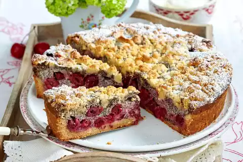 Approx. 2⁄3 Spread the crumble into a well greased spring plate (top 30 cm Ø, 6 cm high). Press down as a base, while pulling up an approx. 3 cm high edge. Sprinkle with breadcrumbs and spread the cherries on top.