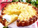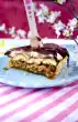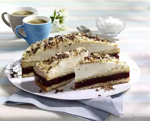 Whip the cream until stiff, adding vanillin sugar, cream firming agent and 1 tablespoon of sugar. Loosen the cake ring. Spread the cream on the cake in a dome-shaped manner using a pallet dipped in water. 3. crumble the base and sprinkle it on the cream. Use a peeler to remove shavings from the chocolate and sprinkle over the cake. Chill the cake for another 30-60 minutes, then cut it into pieces with a hot knife