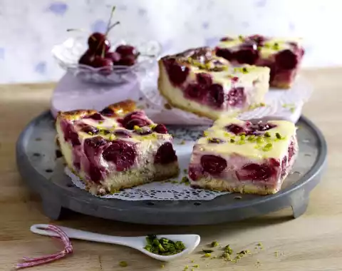 Grease the fat pan of the oven (33 x 40 cm), place the dough on top and smooth it down. Spread cherries on top. Pour the custard over the cherries. Bake in the preheated oven (electric range: 200 °C/ convection oven: 175 °C/ gas: level 3) on the second rack from the bottom for 40-55 minutes. Remove and let cool on a cake rack. Sprinkle with pistachios