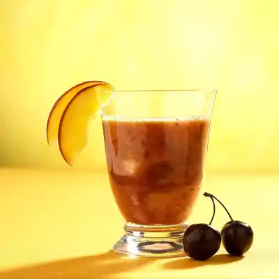Wash, stalk and stone the cherries. Wash nectarines, cut in half and remove stone. Puree the nectarines and lemon juice. Juice the cherries. Divide the nectarine puree into 2 glasses and pour the cherry juice over them.