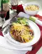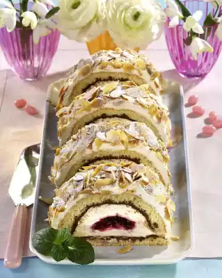 Line the saddle of venison (approx. 30 cm long; 1 l capacity) or box form with foil. Cut 1 wide (approx. 18 x 30 cm) and 1 narrow plate (approx. 10 x 30 cm) from the sponge cake (rest of the sponge cake can be used for other purposes). Dice nougat and melt in a hot water bath. Coat both plates with nougat, let them dry for about 5 minutes. Line the mould with the large plate, nougat side up