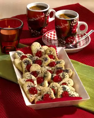 Roll out the dough on a floured work surface to a thickness of approx. 4 mm and cut out approx. 50 hearts with a heart cutter (approx. 4 cm Ø). Sprinkle the cookies with poppy seeds and decorate with half a cherry. Place the cookies on 2 baking trays lined with baking paper. Bake the trays one after the other in a preheated oven (electric cooker: 175 °C/ convection oven: 150 °C/ gas: level 2) for about 12 minutes. Take out and let cool down