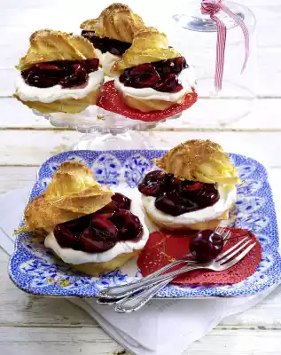 Cut the cream puff in half horizontally. Caramelize 3 tablespoons of sugar with 1 tablespoon of water. Decorate the cream puff lids with the caramel using a teaspoon. Spread the cream with a spoon on the cream puffs first, then the stewed cherries and finish with 1 "lid" each