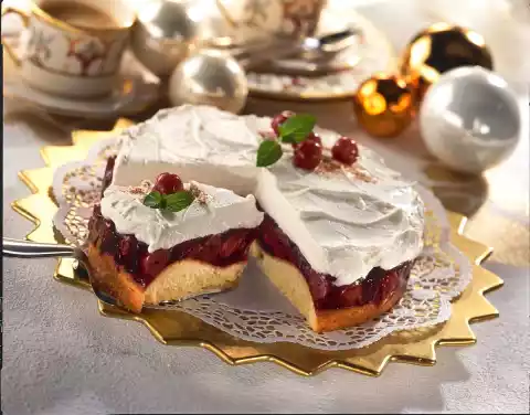 Cover the cake with a cake ring. Spread the compote on it and put it in a cool place for about 2 hours. Stir mascarpone, quark, cinnamon and remaining sugar until smooth. Whip the cream until stiff, pour in the cream firming agent and fold in. Spread the cinnamon cream on the compote in waves. Decorate with the rest of cherries, cinnamon and mint