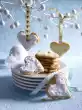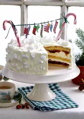 Whip 250 g cream until stiff. Remove cake from the ring. Spread the cake with cream all around. Crumble meringue. Sprinkle the cake with the meringue. Decorate with candy canes and paper garland.