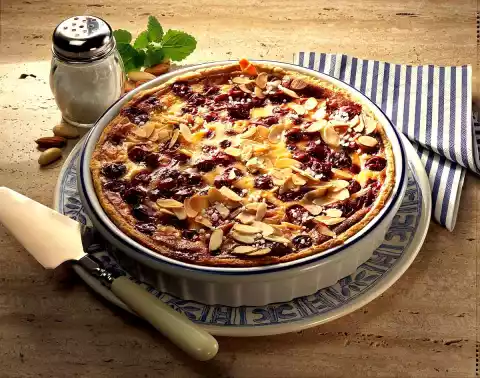 Pour over the sour cream egg icing and bake in the preheated oven (electric: 200°C/ gas: level 3) for approx. 45 minutes. Sprinkle almond flakes over the tart halfway through the baking time. Sprinkle the tarte with sugar crystals before serving.