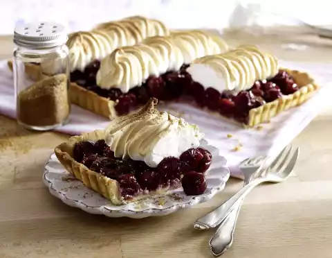 Roll out the short pastry rectangularly (approx. 24 x 32 cm) on a floured work surface. Line a tart mould with the pastry, press on, cut off any protruding edges. Sprinkle the base with nuts. Spread cherries on top.