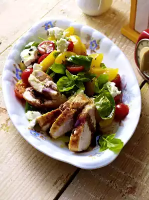 Wash the basil, dab dry and remove the leaves. Mix into the salad. Crumble cream cheese over it. Season meat with salt and pepper. Cut into slices and serve with the salad. Sprinkle with balsamic cream