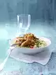 Season with salt and pepper. Shortly before the end of frying, add the lemon wedges and juice. Arrange meat, noodles and salad on plates. Garnish with basil and lemon wedges