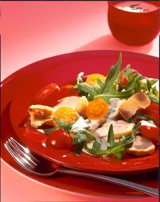 Mix yoghurt, vinegar, salt, pepper and mint. Remove the chicken fillets from the pan and let them cool down for about 5 minutes. Break the pita bread into small pieces. Cut chicken fillets into thin slices and mix with cherry tomatoes, rocket and mint yoghurt. Arrange on plates and sprinkle with the pita pieces