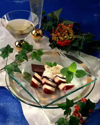 First add about 1 cm of the red liquid. Place the mould in a cool place until the liquid gels. Add half of the light liquid and also refrigerate until it is firm. Proceed with the remaining liquid as above. Put the dessert in a cool place for about 3 hours. Turn out of the mould, cut into slices and serve decorated with cream, a biscuit and mint leaves as desired
