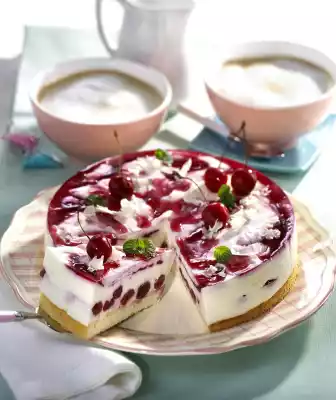 Let it cool down. Soak gelatine in cold water. Drain the cherries. Collect 175 ml of juice. Squeeze 2 sheets of gelatine and dissolve. Gradually mix with the cherry juice. Chill for about 30 minutes until the juice starts to gel slightly. Mix yoghurt, 100 g sugar and vanillin sugar. Squeeze 10 sheets of gelatine, dissolve. Mix some yoghurt with the gelatine. Stir everything into the yoghurt. Whip the cream until stiff and fold in. Remove the base from the tin, remove the baking paper.