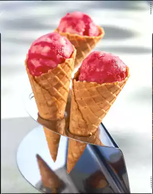 Whip the cream until stiff and fold it in carefully. Mix yoghurt mass and cherry puree and place in a metal bowl. Place in the freezer for at least 6 hours. Stir several times. Leave to stand at room temperature for about 10 minutes before serving. Use an ice-cream scoop to cut out balls and serve in ice-cream cones if desired.