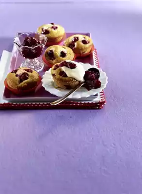 Mix flour, sugar, baking powder and salt in a large mixing bowl. Whisk eggs, oil and 150 g yoghurt, pour into the flour mixture and mix briefly. Fold in 200 g sour cherries. Grease a muffin tray (12 troughs of approx. 125 ml) and dust with flour. Fill the dough evenly into the troughs. spread 100 g sour cherries on the dough