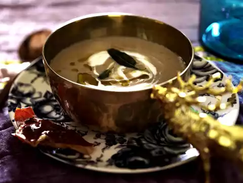 Whip the cream until semi-stiff. Finely puree the soup. Stir the cream, up to 2 tbsp., into the soup, mix again with a blender. If the soup is still too thick, stir in some water. Season to taste with salt and pepper. Divide the soup into bowls or deep plates. Spread the rest of the cream and sage leaves on top. Drizzle with sage oil. Serve with Parma ham Wan-Tans