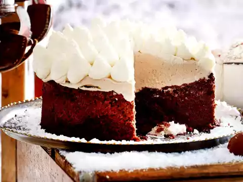 Whip 450 g cream until very stiff, fold into 250 g chestnut cream. Remove the base from the mould. Spread the cream dome-shaped on the base. Whip 300 g cream until stiff, allow cream stiffener to trickle in. Pour cream into a piping bag with a perforated spout and squirt it onto the chestnut cream in patches close together. Chill the cake for about 1 hour.