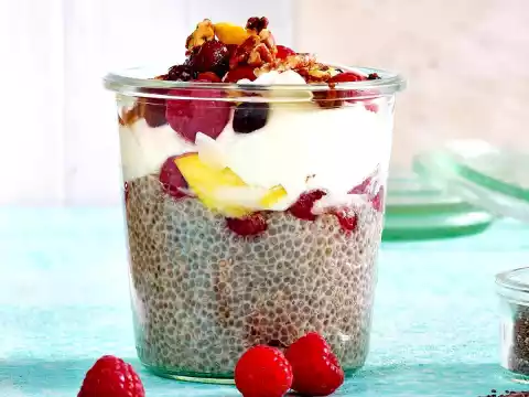 Divide chia pudding into four glasses. Spread nectarine and half raspberries on top. Add the curd cheese. Spread the rest of the raspberries on top. Sprinkle with cranberries, coconut chips and pecans.