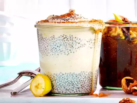 Peel the bananas, cut them into slices, spread them on a plate lined with foil, freeze overnight. Pour 400 ml milk, 3 tablespoons brown sugar and 4 tablespoons chia seeds into a screw glass, shake vigorously. Leave to swell in the refrigerator for about 12 hours. Shake well for the first hour.