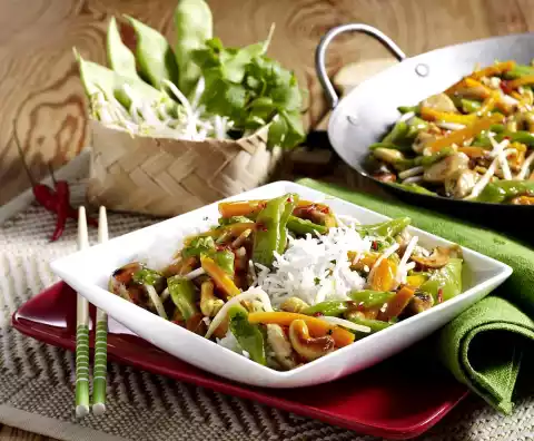 Heat 2 tablespoons of oil in a wok or large frying pan. Briefly roast the cashew nuts in it until light brown, then remove them (oil remains in the pan). Fry the chicken cubes in portions. Remove the meat.