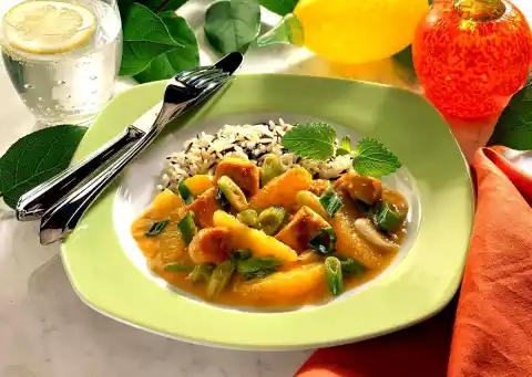 Brown the chicken meat all around, dust with curry and deglaze with stock. Add spring onion, orange slices and orange juice to the pan and let everything simmer for about 5 minutes. Refine with crème fraîche and season with salt and curry.