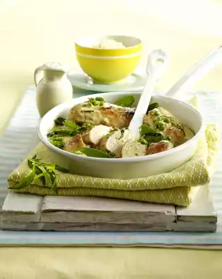 Stir mustard into the tarragon cream sauce and season with salt and pepper. Drain the sugar snap peas and peas on a sieve and add to the chicken fillets in the pan. Add the rice.