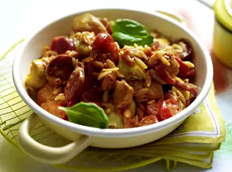 Peel and finely dice the onion and garlic. Peel the skin from the salami. Cut the sausage into slices. Wash chicken filet, dab dry and cut into cubes.