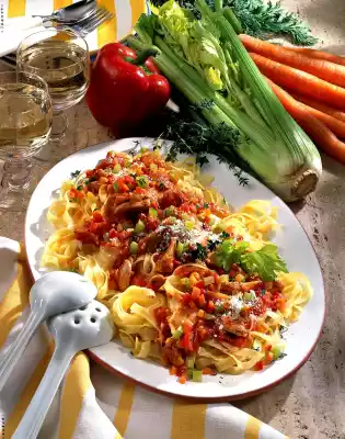 Season again with salt, pepper, paprika and sugar. Meanwhile cook the noodles in boiling salted water for about 8 minutes. Drain and quench. Arrange pasta and chicken bolognese on a plate.