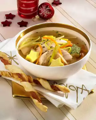 Cut the meat into slices, add to the soup and season again. Turn out the egg from the pan. Cut out stars and put them into the soup. Serve the soup. Add croissant-ham sticks.