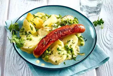 In the meantime, heat oil in a pan and fry the sausages for 4-6 minutes, turning them until brown. Wash parsley, shake dry, remove leaves from the stalks and chop finely, except for a few for garnishing. Add kohlrabi to the peas in the pan, bring to the boil and remove from the heat. Season to taste with salt and pepper. Arrange kohlrabi vegetables and sausage on plates, garnish with parsley.