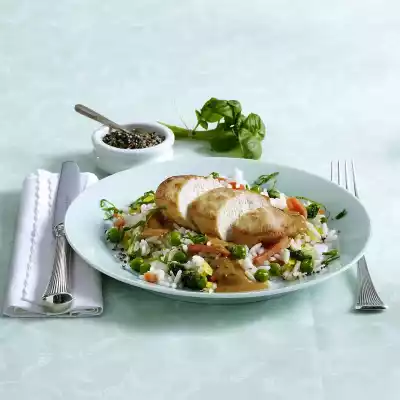 Cut the chicken into slices and arrange on the rice with the sauce. Sprinkle with basil strips.