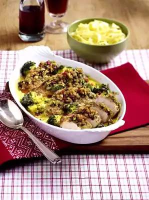 Place the prepared sauce, meat and vegetables in an ovenproof dish. Spread the crust on the meat. Sprinkle with diced ham. Cook in the preheated oven (electric cooker: 200 °C/ convection oven: 175 °C/ gas: level 3) for approx. 40 minutes. Serve with ribbon noodles