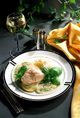 Wash the basil, dab dry. Pluck leaves, except for a few for garnishing, cut into strips and add to the sauce. Serve the chicken fillets with the sauce. Garnish with basil leaves and lemon slices and sprinkle with coloured pepper to taste.