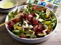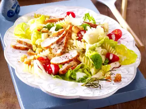 Arrange salad with noodles, tomatoes, slices of meat and crôutons on a plate. Slice Parmesan cheese over it and sprinkle with dressing. Sprinkle with pepper.