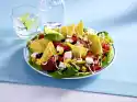 Drain the pasta and let it drain. Clean, wash and dry the salad. Cut into pieces. Wash tomatoes, grate dry and cut in half. Mix sour cream, mustard, salad cream, stock, lemon juice and sugar.